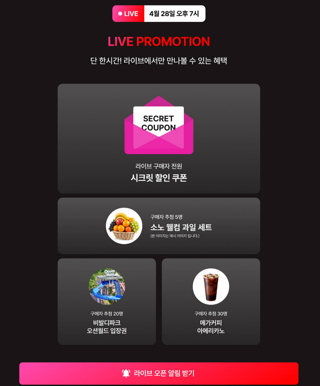 - 라이브 방송 사전 알림 신청은 필수! 방송 중에만 공개되는 시크릿 쿠폰이 있으니 꼭 알림 설정해 두세요.
