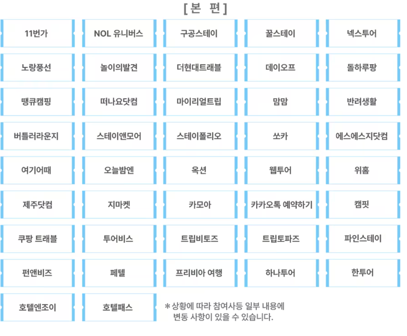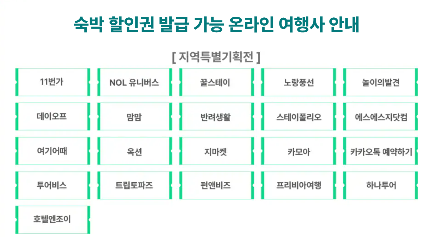 | 쿠폰 발급처 | 야놀자, 여기어때, 인터파크, 마이리얼트립 등 40여 개 OTA |