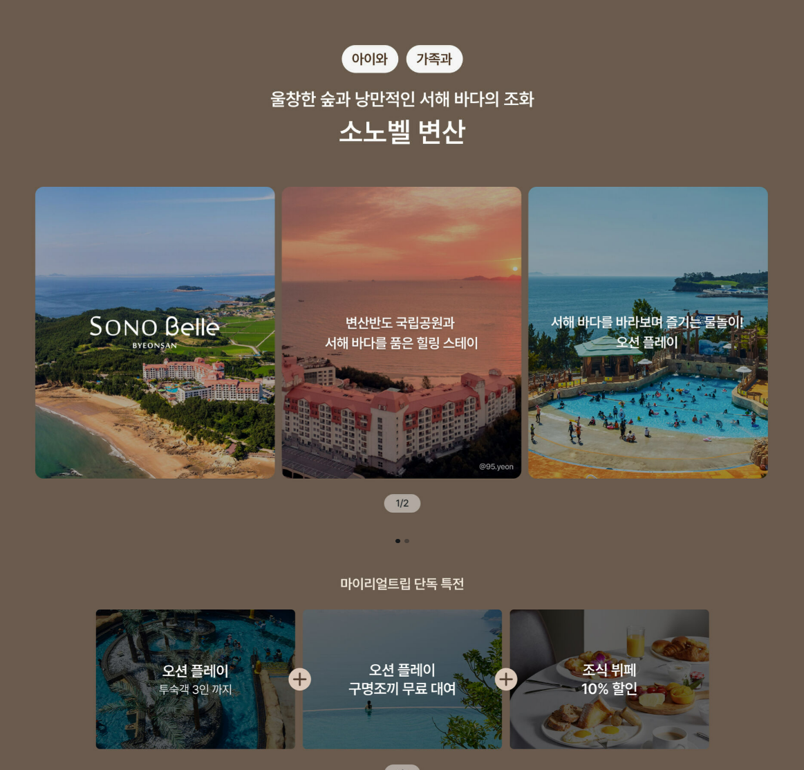 서해 바다와 변산반도 국립공원이 어우러진 소노벨 변산은 3세대 가족 여행지로 적극 추천하고 싶은 곳입니다. 자연환경이 정말 빼어나고, 리조트와 호텔 객실 모두 구성이 다양해서 선택의 폭이 넓어요.