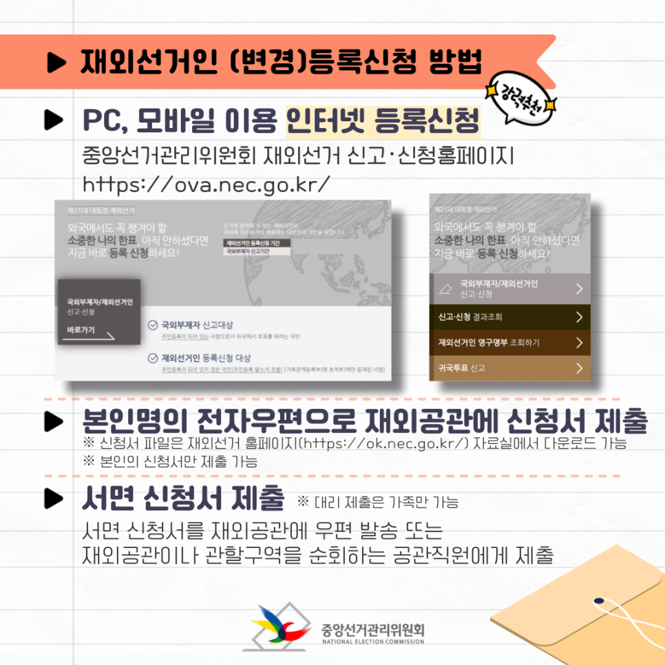 | 인터넷 등록 | https://ova.nec.go.kr 에 접속하여 등록 - 주민등록번호 확인 - 이메일 주소 유효성 확인 - 신청서 작성 및 제출 |