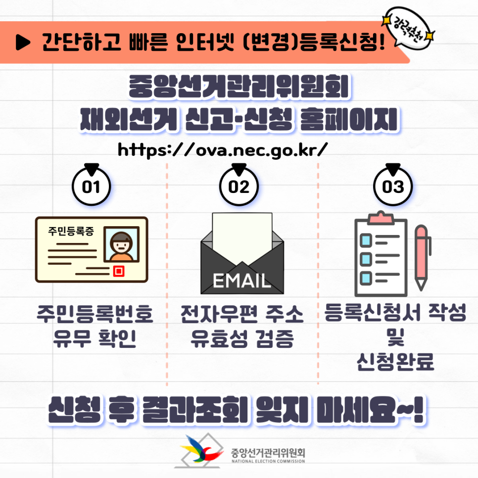 https://ova.nec.go.kr 홈페이지에서 등록 결과 조회가 가능합니다. 신청 후 꼭 확인해 주세요!