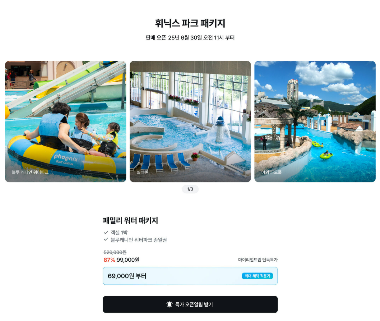 | 패밀리 워터 패키지 | 객실 1박 + 워터파크 종일권 | 520,000원 | 69,000원부터 |