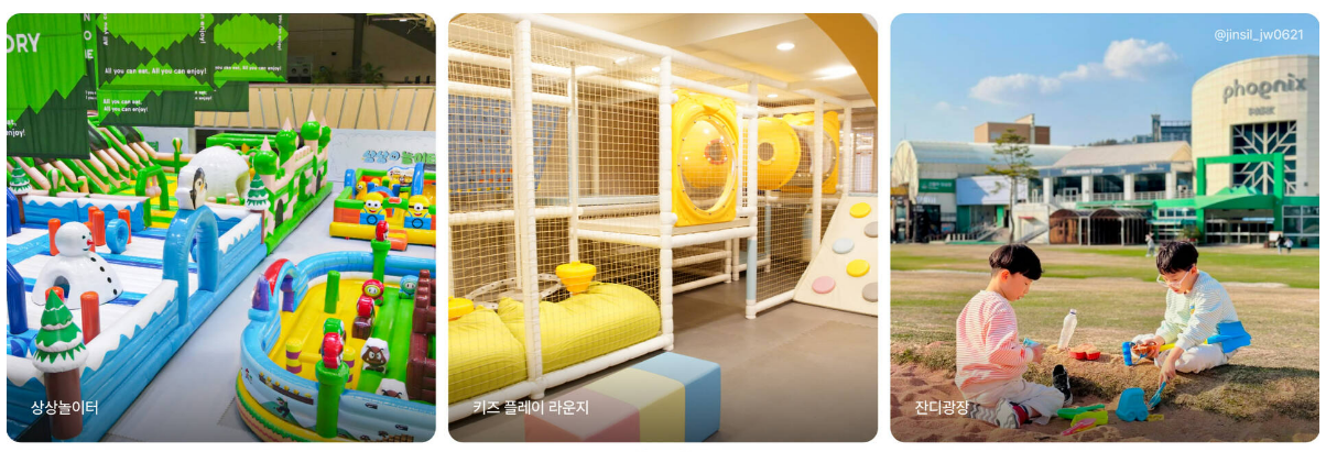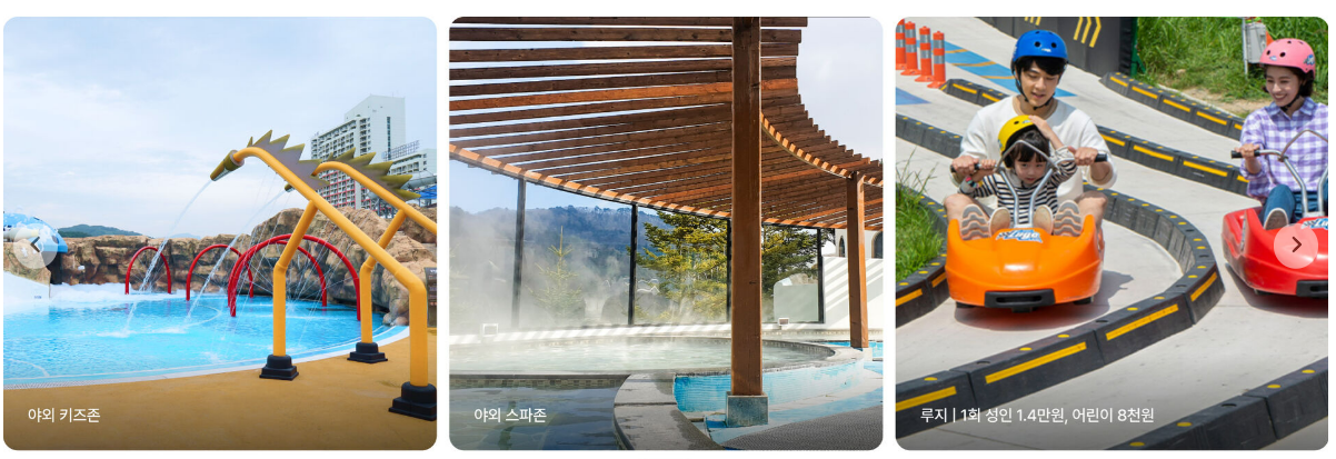 - 야외 워터슬라이드 / 실내 스파 / 썰매 루지 / 상상놀이터 등 다양한 시설