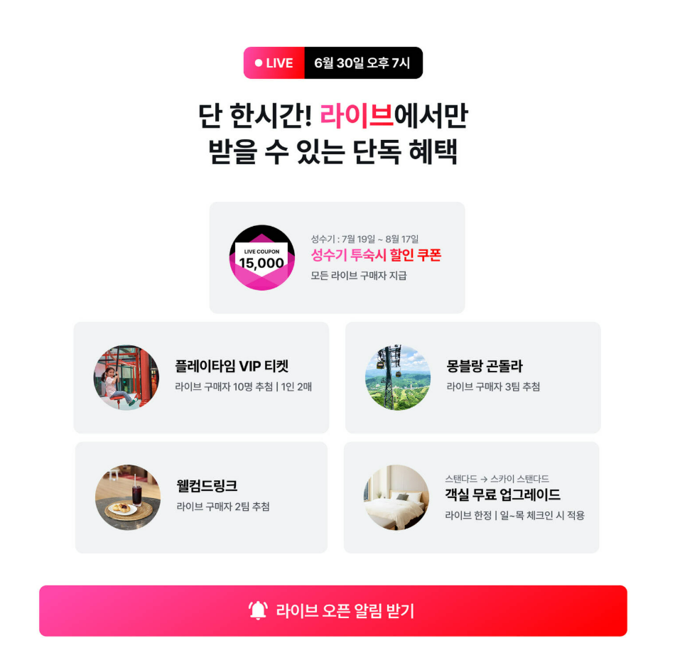 - 7월 19일~8월 17일 성수기 투숙 시: 라이브 커머스 쿠폰 15,000원 적용