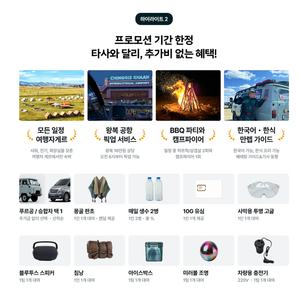 | 3박 4일 | 어기호수, 테를지, 미니사막, 쳉헤르온천 | 게르 숙박 3박, 전용차량, 캠프파이어, BBQ 2회 | 648,000원~ |