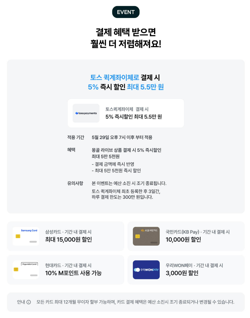 - 토스 결제: 5% 즉시 할인 최대 5.5만원